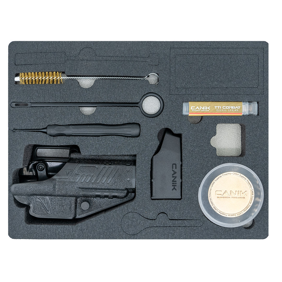 Material: Steel (slide, barrel, compensator); polymer (frame); aluminum (magwell)